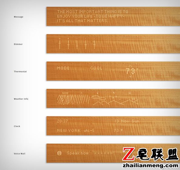 “Mui”是一个AI 管家,外观像一个扁平的木条,它是半透明的电容触摸,触摸(语音唤醒)即会显示内容,而平常它就是一块普通的木条,能很好的融入家居环境。